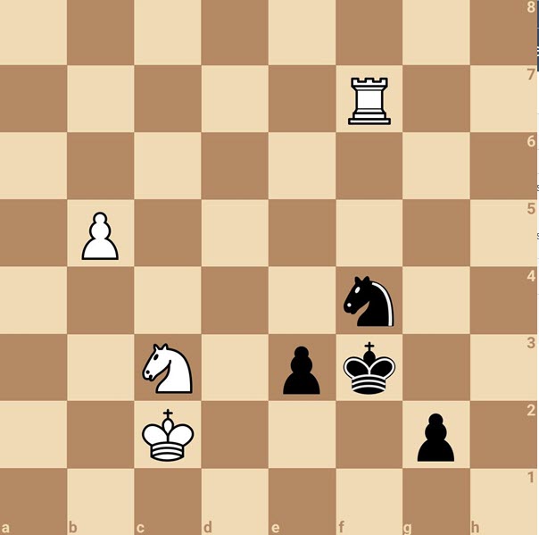 Want na 1. b6 g1D! 2. Txf4+ Kxf4 3. Pe2+ Ke5! staat de zwarte koning in het vierkant van de pion op b6 na 4. Pxg1 Kd6 en dus gaat de witte pion verloren.