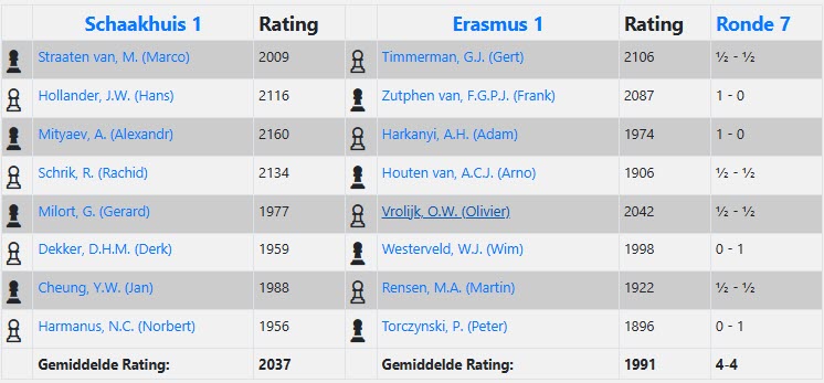 Na een spannende middag stond er een 4-4 tegen concurrent Erasmus op de borden. Derk en Norbert verloren vrij snel. Jan speelde remise. [0.5-2.5] Vervolgens won Alexandr, waara we 1 punt achter stonden, met diverse goede stellingen. Marco maakt remise op bord 1, zodat het 2-3 is met nog 4 partijen te gaan. Rachid staat een pion voor, maar komt uiteindelijk niet er doorheen. Gerard en zijn tegenstander spelen nog een tijdje door in een remise toreneindspel todat de laatste pion is geslagen. 3-4 achter dus, maar Hans heeft een handvol pionnen met T+L tegen 2T. De pionnen zijn niet te stoppen, en zo wordt het 4-4.