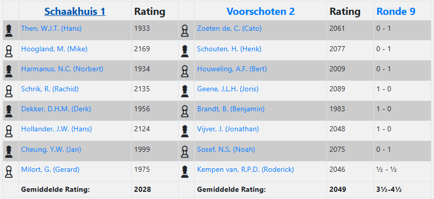 Bij deze wil ik alle vaste teamspelers, maar ook alle invallers bedanken voor dit seizoen. Complimenten zijn er in elk geval voor Rachid (7 uit 9, TPR 2169), Derk (5.5 uit 7, TPR 2138), en Hans (4 uit 5, TPR 2267). Vermoedelijk gaan we afscheid nemen van Harold die in Spanje gaat wonen, terwijl we hier ook lekker eten, wijn en zon hebben. 🙂